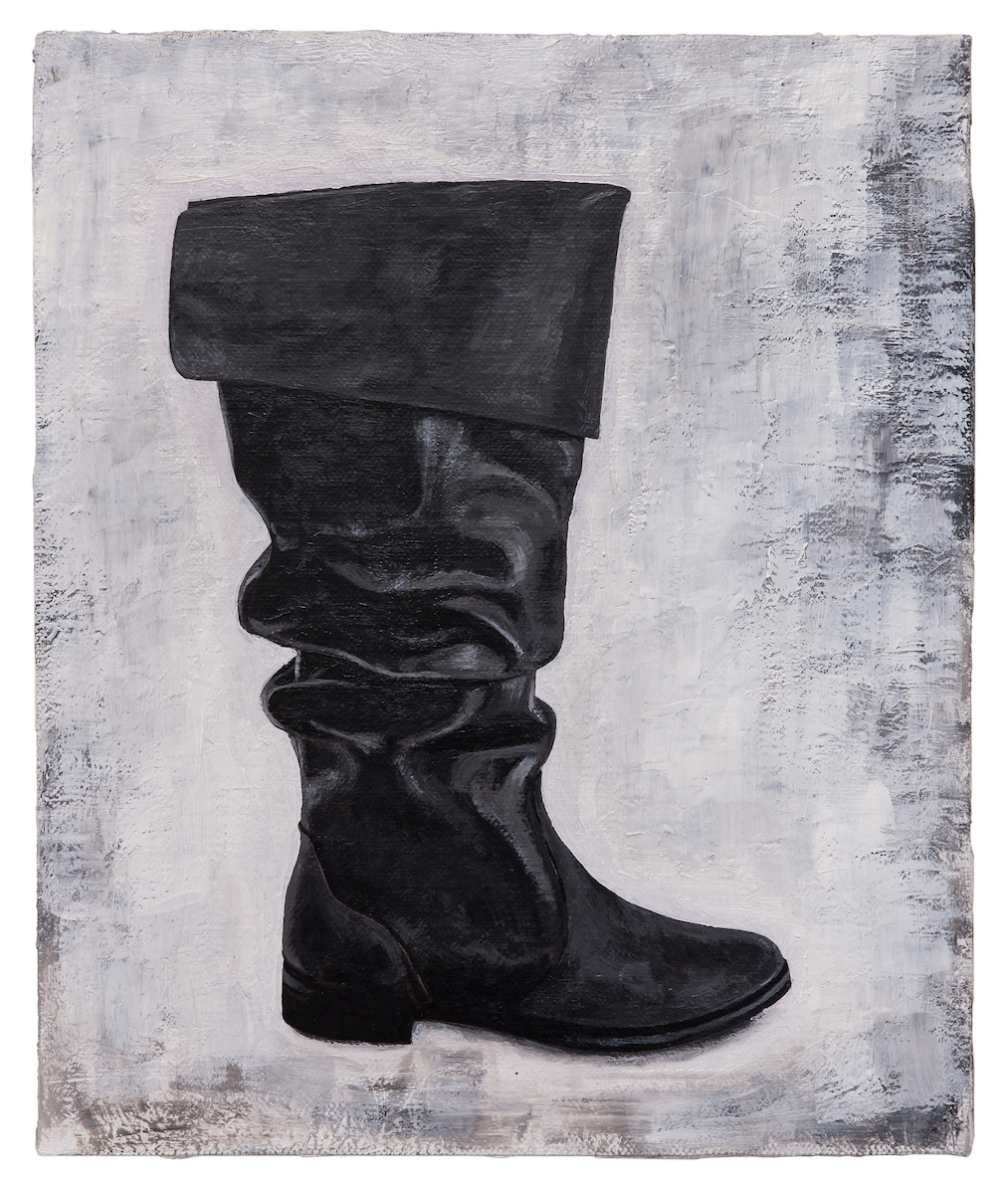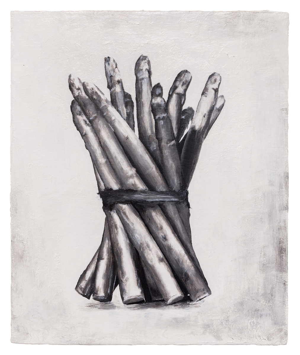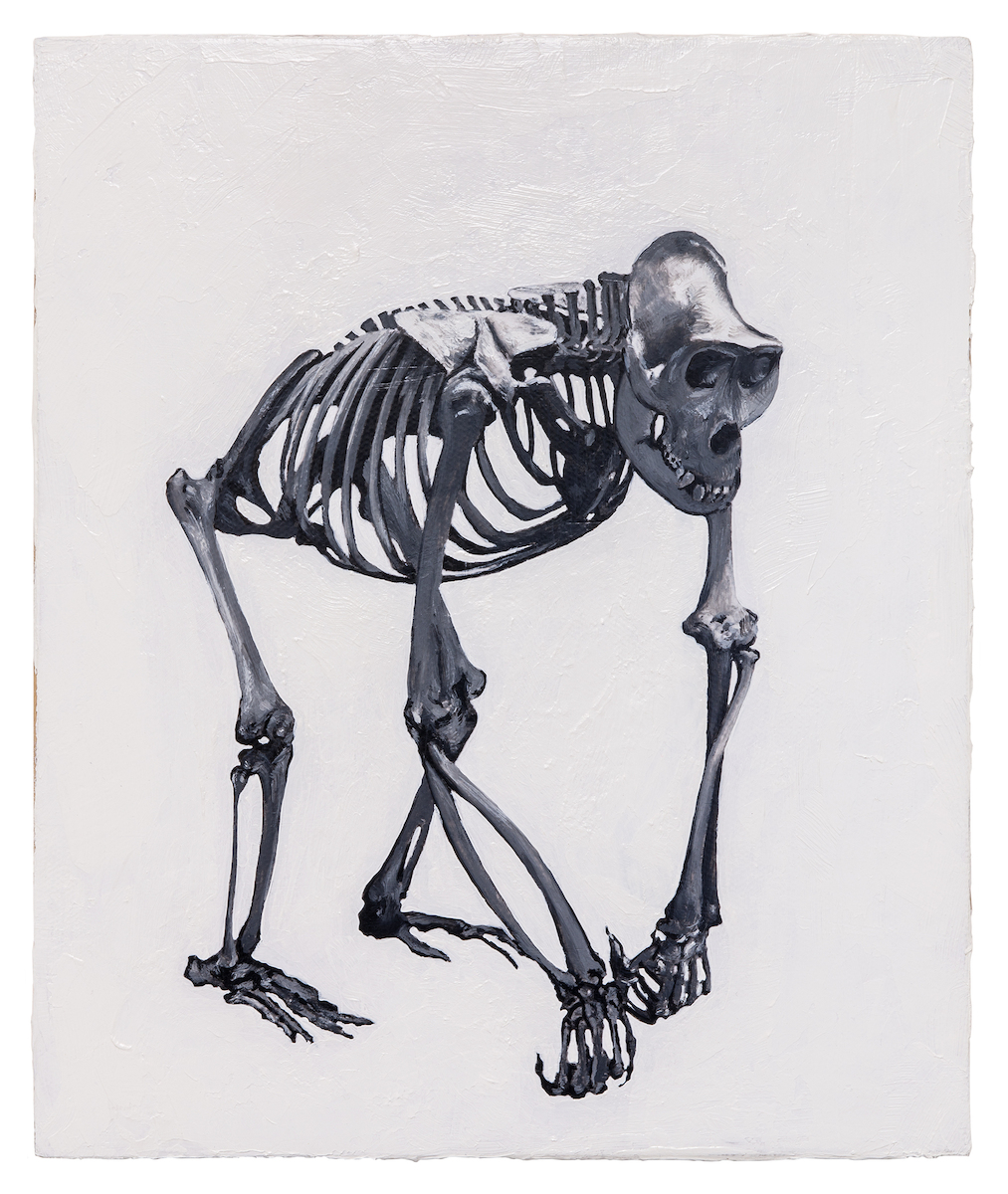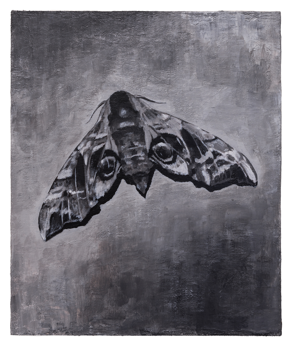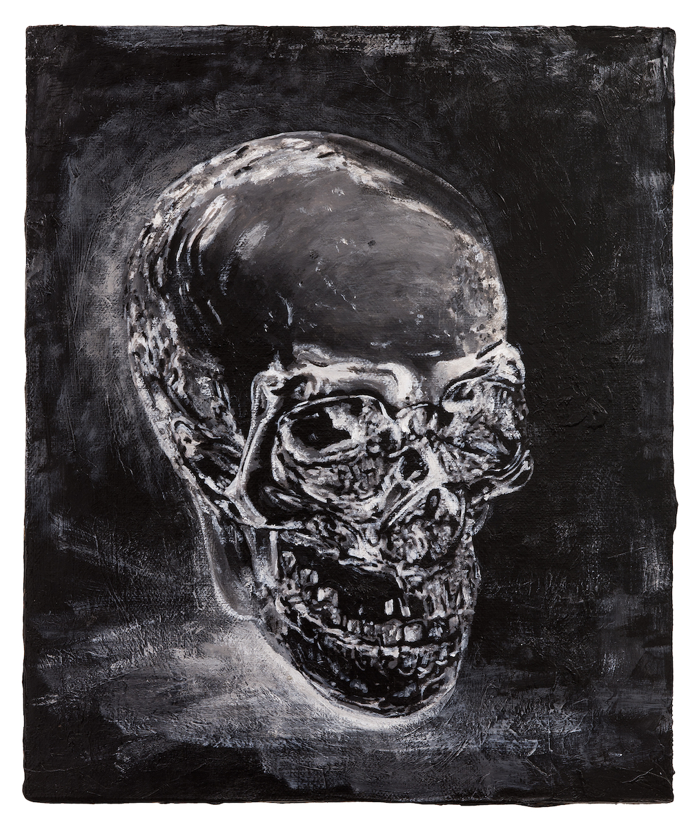 Already since the mid-1990s, the artist has been dealing with questions regarding cultural codes and cultural memory in his larger work groups. In this series, he deliberately uses the colours black and white as well as various shades of grey, which accentuate his sophisticated and detailed manner of painting. Singularly depicted objects on a 30 x 25 cm canvas, mounted on wood, are immediately recognizable and evoke different associations in the beholder. The lion for instance, which occurs recurrently in this series, with its stately demeanour in the work 'Hieronymus-painting (D.T.M.C.)' 2014-2015, 180 x 260 cm symbolises strength and potency. Other motifs are reminiscent of baroque still lives depicting skulls, animal skeletons and moths, symbolising the transience of earthly existence.
